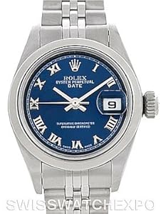 Rolex Date Ladies Steel Watch . Model 79160. Officially certified chronometer self-winding movement. Stainless steel oyster case 25.0 mm in diameter. Rolex logo on a crown. Stainless steel smooth bezel. Scratch resistant sapphire crystal. Blue dial with applied roman numerals. Date calendar window at 3 o'clock aperture. Stainless steel oyster bracelet with a fold over clasp. Fits 6.5" wrist.