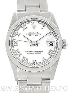 Rolex Midsize Datejust Steel Watch 78240. Officially certified chronometer self-winding movement with quickset date function. 31 jewels. Caliber 2235. Stainless steel oyster case 31.0 mm in diameter. Rolex logo on a crown. Stainless steel smooth bezel. Scratch resistant sapphire crystal. White dial with applied roman numerals. Stainless steel oyster bracelet with fold over clasp.