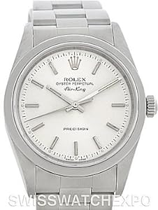 Rolex Oyster Perpetual Air King Watch. Model 14000. Officially certified chronometer self-winding movement. Stainless steel case 34.0 mm in diameter. Rolex logo on a crown. Stainless steel smooth domed bezel. Scratch resistant sapphire crystal. Silver dial with applied stick hour markers. Stainless steel oyster bracelet with fold over clasp. Fits 8" wrist.